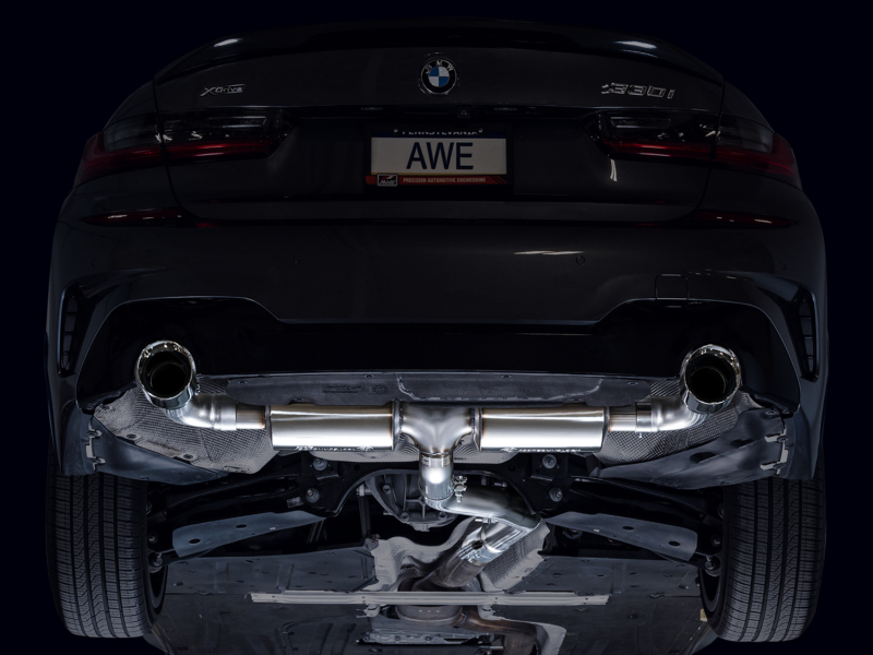 Beginning after the secondary catalyst, the Touring Edition picks up right before the rear axle and provides a full single 3” route from this point and splits to dual patented drone-canceling 180 Technology™ resonators, followed by 3” tip outlets. Given the straight-through design and lack of packing material, the 180 Technology® resonators’ job is to defeat drone prone frequencies that would otherwise be experienced within the cabin. Maximum flow is maintained and exterior volume is increased with the interior experience being much more sophisticated and tame. The package is completed with dual 4.5” slash-cut, double-walled tips, available in chrome silver or diamond black. Crafted in PA, USA, from US-sourced .065”-wall T304L stainless steel, every aspect is meticulously engineered, designed, and manufactured in-house at AWE. Backed by AWE's Lifetime Warranty, No CEL Light Guarantee, and Perfect Fitment Guarantee.We recommend the following configurations--330i: if you plan to upgrade anything further upstream, we recommend the Touring Editon. If you're keeping everything stock, note the Touring Edition will resemble stock from within the cabin on the 330i sedan, and you should consider the Track Edition. 430i: Given the coupe design of the 430i, interior acoustics differ when compared to its sedan sibling, with new frequencies making their way into cabin. Due to this, and with all factory emissions equipment in place, we recommend equipping the Touring Edition to ensure an enjoyable driving experience. Drivers can, of course, equip a Track Edition, but it may be much for some, especially if anything upstream has been changed. You’ve been warned.