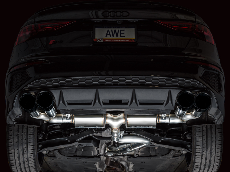 Introducing the first AWE Exhaust for the Audi S3 to ever feature patented drone-canceling 180 Technology®. The Touring Edition features a 3” inlet complete with an adapter to accommodate the factory downpipe perfectly while leaving an open 3” connection. In the rear resides AWE’s patented 180 Technology® resonators responsible for maintaining straight-through performance while decimating drone-prone frequencies. Thanks to the design and construction of 180 Technology® resonators, the internals will not break down and degrade over time causing tone change. Just full-bodied, drone-free rumble for life from the point of installation. This configuration provides the best ratio of interior refinement and exterior rumble on the market. No valves needed. Switch driving modes and the exhaust will render the same result as a vavled exhaust. It's the do-it-all exhaust for every day drivers. Comes complete with quad 4.5" slash-cut, double-walled tips in diamond black. The AWE Touring Edition for the 8Y S3 is made in the USA and backed by AWE’s Fitment Guarantee, 50 state emissions compliance, No Check Engine Light Guarantee, and the AWE Lifetime Warranty.