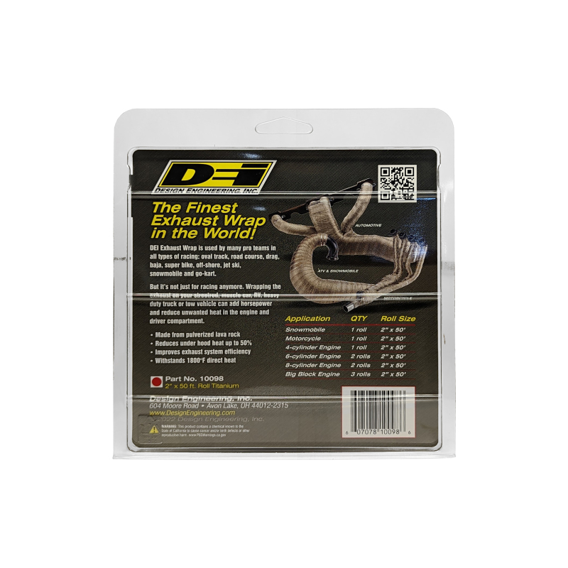 DEI's ORIGINAL Titanium(TM) exhaust wrap, with LR Technology, is made from pulverized lava rock, stranded into a fiber material and woven into a proprietary weave. Titanium wrap is engineered to be stronger than most wraps and more durable for improved thermal performance and reliability. Perfect for any automotive or motorcycle application! Withstands 1800°F direct/2500°F intermittent heat Promotes increased flow for improved performance Reduces temperature & vibration breakdown Extremely pliable for a tight and secure wrap DEI HT Silicone Coating not required Pre-wetting roll not necessary for wrapping Hi-tech carbon fiber look High resistance to abrasions, oil spills, temperatures and vibration breakdown NOTE: Wrapping of the catalytic converter is not recommended, as overheating can lead to reduced lifetime of the converter. Instead, try our Corvette Catalytic Converter Shield or create your own shield using our Floor & Tunnel Shield II(TM). Note of Caution:Wrap is not designed to be moved or removed after it has been heat cycled. After the fibers have been heated, they lose their initial flexibility. This does not reduce the thermal properties of the exhaust wrap. Be aware of this before you decide to remove the wrap. For this reason, you should avoid wrapping any flex-pipes or flex-joints. Note about Titanium Exhaust Systems:DEI does NOT recommend wrapping exhausts made of titanium. The alloys used in the production of titanium exhaust systems tend to be thin and are designed to dissipate heat quickly. Wrapping any titanium exhaust pipe, regardless of brand, can hold in too much heat, and make the titanium alloy turn brittle and prone to premature cracking. If you are seeking to reduce the heat on a titanium exhaust system, DEI recommends using alternatives such as our flexible heat shields.