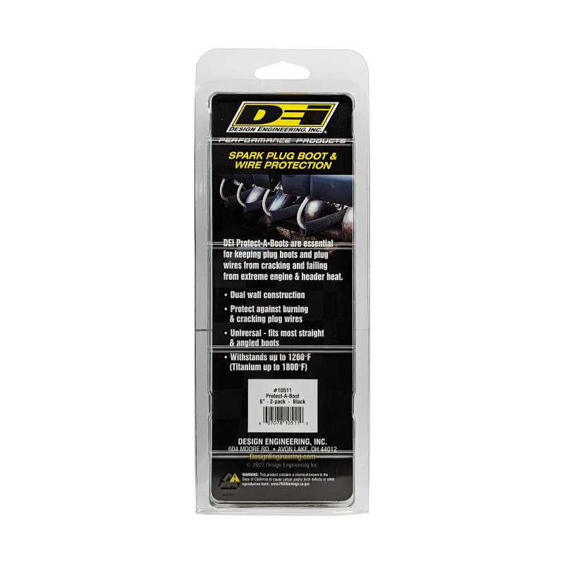 Protect-A-Boots solve the problem of burning and cracking plug boots and wires from header and engine heat. Protect-A-Boots are made from a high temperature resistant glass fiber material and treated with a proprietary coating, Protect-A-Boots provide spark plug boot and wire protection from extreme under hood heat and helps prevent burn-through, hardening and cracking of boots. Our 6'' Protect-A-Boots come with a reinforcement ring at the base for easy plug removal during maintenance. When working on boots with tight bends, try our Protect-A-Boots Ringless instead. For thicker boots, like MSD or Taylor's, we recommend our Protect-A-Boot(TM) Ringless Sleeves; its larger diameter will allow for a simpler install. Non-flammable & protects against chemicals & resists water Universal - fits most straight or angled boots 1 in. internal diameter Double-wall construction for added durability