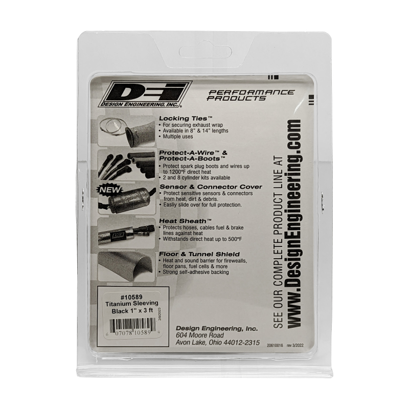 Black Titanium(TM) Protect-A-Sleeve solves the problem of burning, cracking plug wires, lines & hoses from engine & exhaust heat, now in a stylish black finish. DEI's Black Titanium Protect-A-Sleeve with LR Technology(TM) offers the best possible line sleeve protection on the market. Developed specifically for any application where extreme high heat is present, these Titanium sleeves will protect wires, lines and cables when exposed up to 1800°F direct heat/2500°F radiant. Developed with DEI's proprietary LR Technology, these high temperature rated sleeves provide superior thermal protection for street vehicles or race engines, protecting fuel, oil lines, spark plug and electrical wires from direct or under hood radiant heat. Water and heat resistant, they are also ideal for Powersports ATV/UTV, motorcycle, personal watercraft, snowmobiles, and marine use.