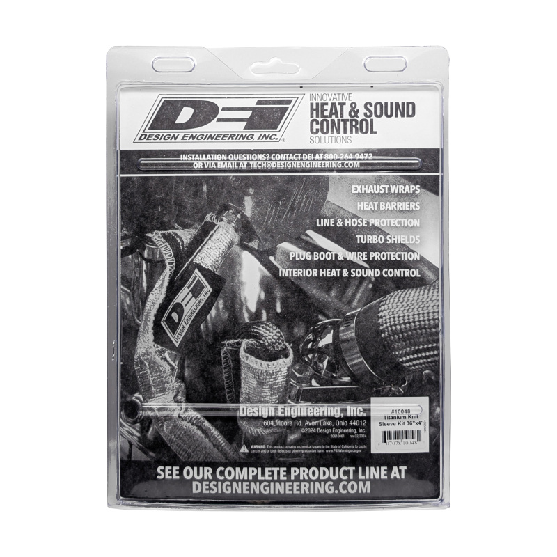 Titanium Knitted sleeves are available in different precut lengths and by the foot sizes. They have a maximum temperature rating of 1800°F with a continuous rating of 1382°F. Perfect for larger exhaust pipes as they can expand up to 1.5 times normal diameter allowing to install over flanges and sensor threads. You can cut to length and simply roll the ends. Protect components and keep heat from transferring into the cabins. Titanium Knit Sleeve, 36 in. finished length for 4 in. tube. Includes ties and tool.